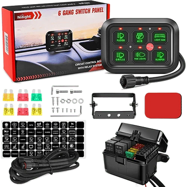 6 GANG SWITCH PANEL SYSTEM. OPERATING VOLTAGE, 12-24V. ALLOWS YOU TO CONTROL UP TO 8 DIFFERENT ACCESSORIES AT A TIME.